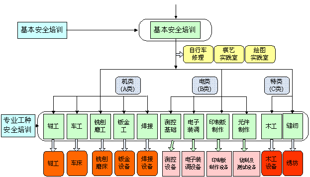 第七条 “专业工种安全培训”为学生提供分工种的安全操作和技能培训。“专业工种安全培训” 分为机械加工类(称为A类)、电子电气类(称为B类)和特殊加工类(称为C类)三大类。机械加工类分A1冷加工(含车工、钳工、铣工等工种)、A2热加工(含铸工、锻工、焊接等工种)和A3现代加工(含数控车工、数控铣工等工种);电子电气类包括电子装调、PCB板制作等工种;特殊加工类包括木工、缝纫、海报印制等。