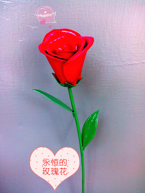 之后我上网找了很多花的图片,找出心仪的图片后先把它画出加工图,(包括花瓣、花萼、花径和叶片各有多少个,怎样分布都想清楚)。因为要用到焊接;之后就去了焊接车间学习焊接技术,听了几堂课考核合格于是我抽时间到钣金车间进行了加技术。像很多事情一样,真正做起来根本没有想象中的那么简单。一开始我用的是0.3mm的不锈钢,钣金车间的吴老师提供了很好的条件,可是由于材料的原因,总是做不出花瓣的感觉,这时恰好又碰到了机械加工部的宋超英老师,他建议我用铝材来做,因为铝的延展性比较好,想想也是这个道理于是我直奔西食堂买了两罐雪碧,喝完后用剪刀把铝皮剪下来,可是由于铝皮太薄也没做成功,最后想着也许只能放弃了。但钣金吴老师鼓励我提出让我用0.5mm的镀锌铁板来制作,同时耐心、又详细地给我分析了0.5mm镀锌铁板材料的特点,认为是可以做出来的,的确没有别的办法了,厚点就厚点吧,姑且试一试。没想到这次制作的过程很顺利,唯一就是在焊接花瓣的时候出了点问题,毕竟是铁板折起来比较困难;焊接花瓣时会有很多缝隙;只能焊一片再加工下一片还要根据已经成形的花瓣来作调整。正所谓“不经历风雨怎能见彩虹”我终于把这朵象征永恒的玫瑰花做出来了。当女友收到礼物时,特别高兴。